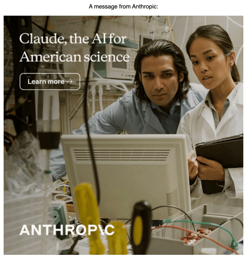 The thought: Tech companies dominated the ad space this week, leaning into HPTOs and newsletter sponsorships. Tech’s focus on newsletters continues as a clear trend. Newer sponsors like Anthropic are appearing more frequently, borrowing Meta and Amazon’s playbook of boosting brand approval with the general public. The messaging focuses on economic impact and scientific advancement.
